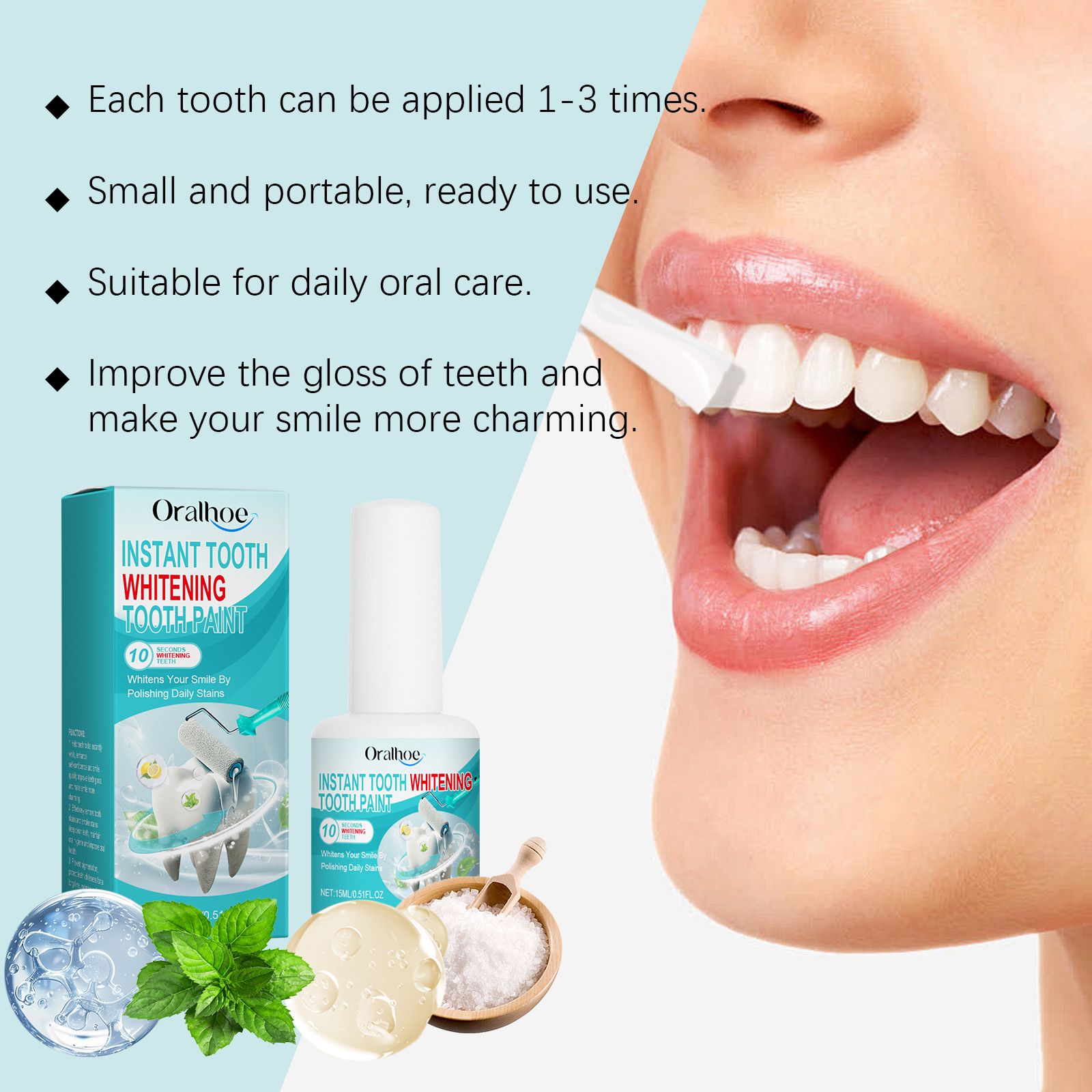 Our tooth cleaning varnish contains hydroxyethyl ulose, lemon fruit extract and peppermint extract. It can effectively the teeth shine, show confidence smile. Nourish and strengthen teeth and build a protective layer. How to use it is simple: 1. First, make sure your teeth are clean and dry. 2. Apply the product lightly and thinly to each tooth, covering it evenly to avoid streaks. 3. Apply 1-3 times to each tooth, at least 10 seconds between each coat, to allow the tooth to dry. Long-term use, ation, easy to use, quick effect.