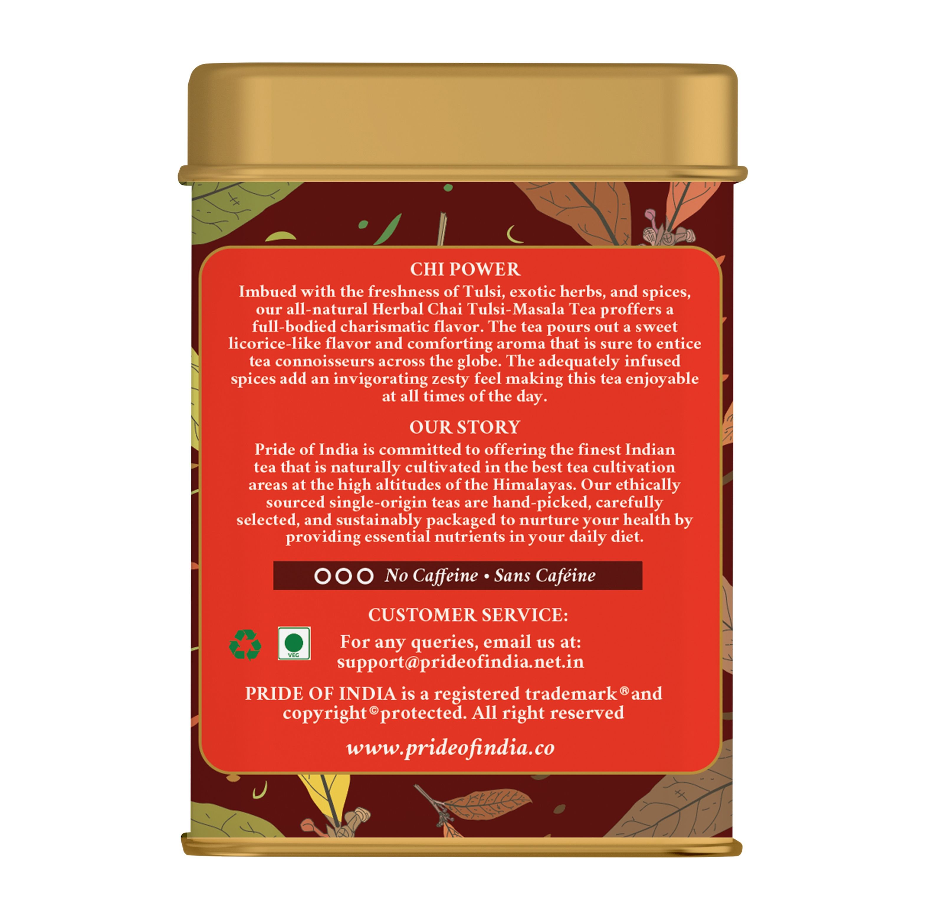 Our naturally decaf Herbal chai combines the benefits of the Tulsi Herbal tea with the aromas of the most exotic Indian herbs and spices like cinnamon, cardamom, clove and ginger. Its invigorating fragrance and zesty flavor connects you to the Indian culture, giving you a glimpse into our glorious heritage and colorful festivities. For a wholesome experience sweetener and creamer may be added.