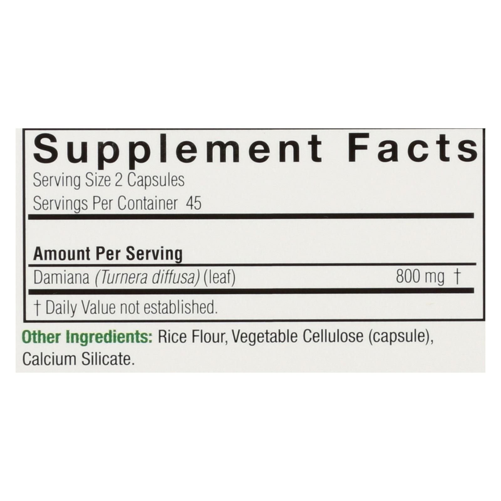Nature's answer damiana 800 mg. Dietary supplement is a holistically balanced herbal supplement that promotes overall health and well-being. Each capsule includes the full spectrum damiana herb that's guaranteed authentic, and the capsules are produced in a cgmp certified facility to ensure superior quality and effectiveness. This single bottle of 90 vegetarian capsules provides 45 two-capsule servings.