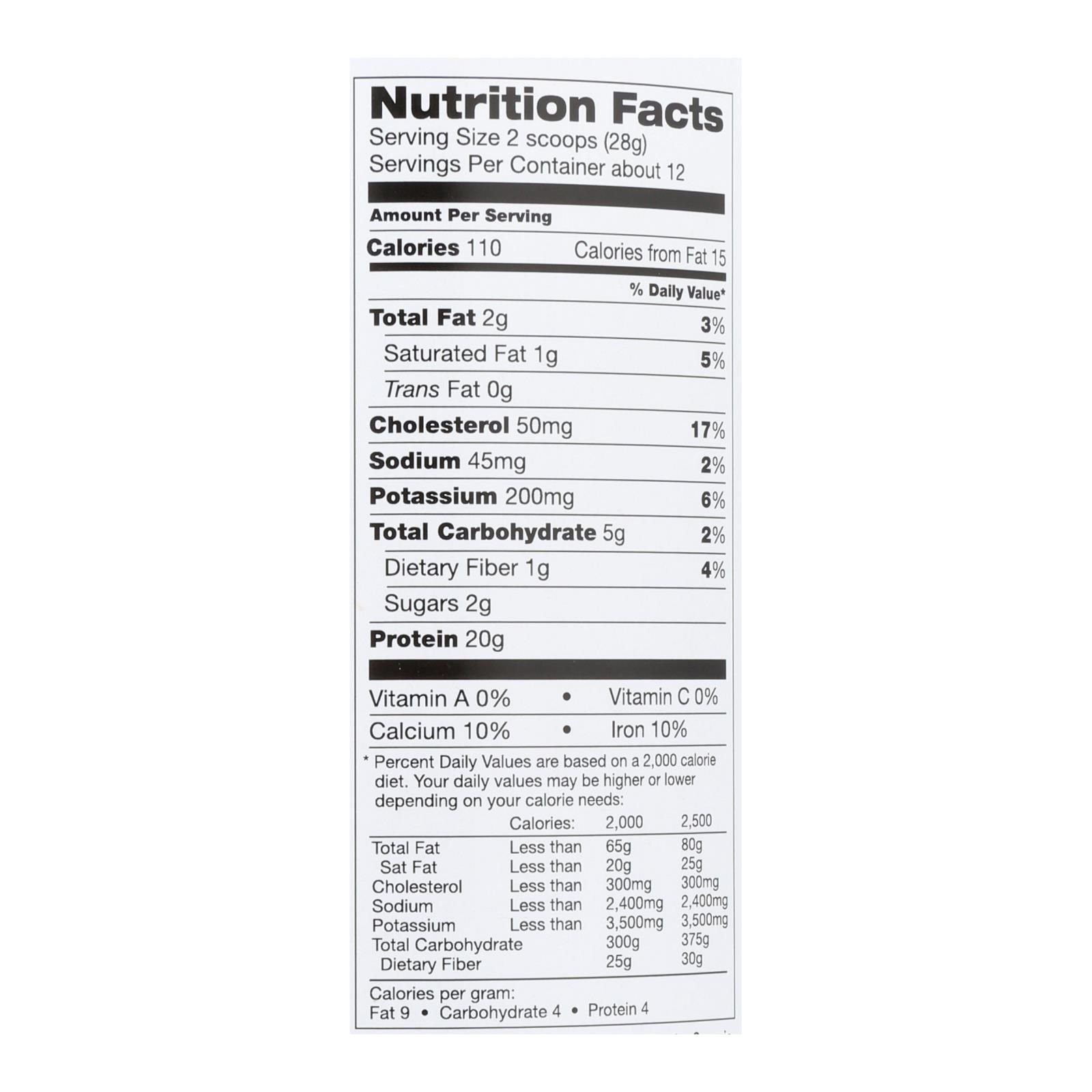 Tera'swhey whey protein, fair trade certified dark chocolate cocoa, is certified gluten-free, kosher-dairy and contains fair trade certified ingredients. Every 12 oz. Canister of fair trade certified dark chocolate cocoa whey protein is made with grass-fed, rbgh/bst-free milk. Each serving provides 20 g. Of protein and 10% each of the daily recommended values of calcium and iron. See nutrition facts panel for allergens.