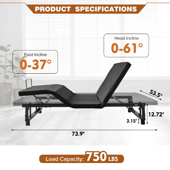 • With separate adjustments for the head and foot sections, our bed frame allows for comfortable sleeping positions. The head section can be adjusted from 0 to 60 degrees, while the foot section can be adjusted from 0 to 40 degrees, enabling you to find the most suitable sleeping angle.
