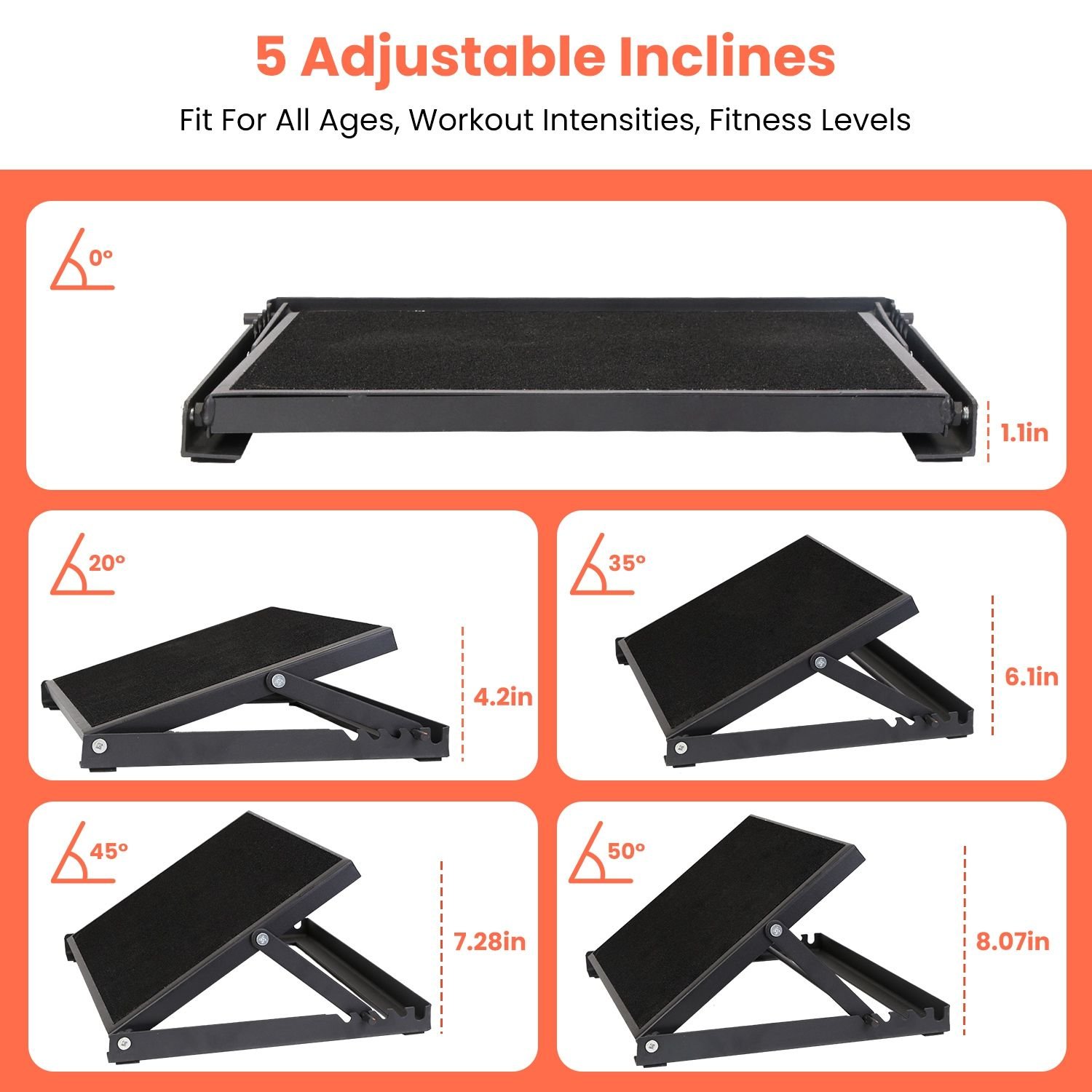 *Adjustable Inclines For All Levels*:Come with 5 adjustable inclines:0°,20°,35°,45° and 50°,allow you to flexibly adjust the angles according to your various demands and workout intensity. We suggest that you can enhance the levels from easy to hard to reduce the possibility of injury. Ideal calf stretch board for all ages and all fitness levels.
