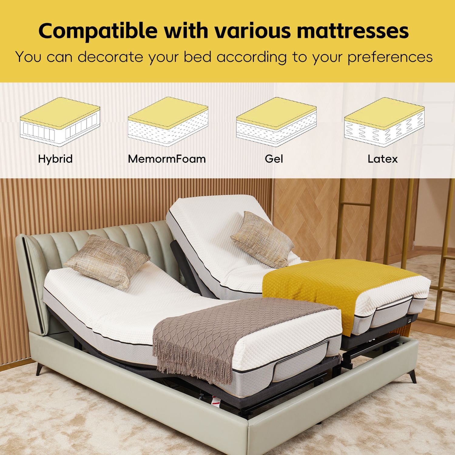 COMPATIBLE WITH VARIOUS MATTRESSES: Complete your optimal bed with the mattress of your choice, this base is compatible with memory foam, gel foam, latex foam, and hybrid mattresses