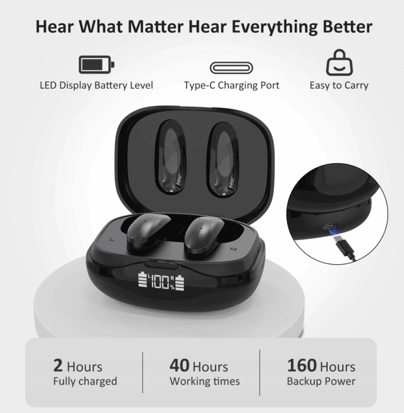 2pc of hearing aid headphones, 1pc of Type-C, 4pc of earplugs, 1pc of charging case, 1pc of brush, 1pc of manual