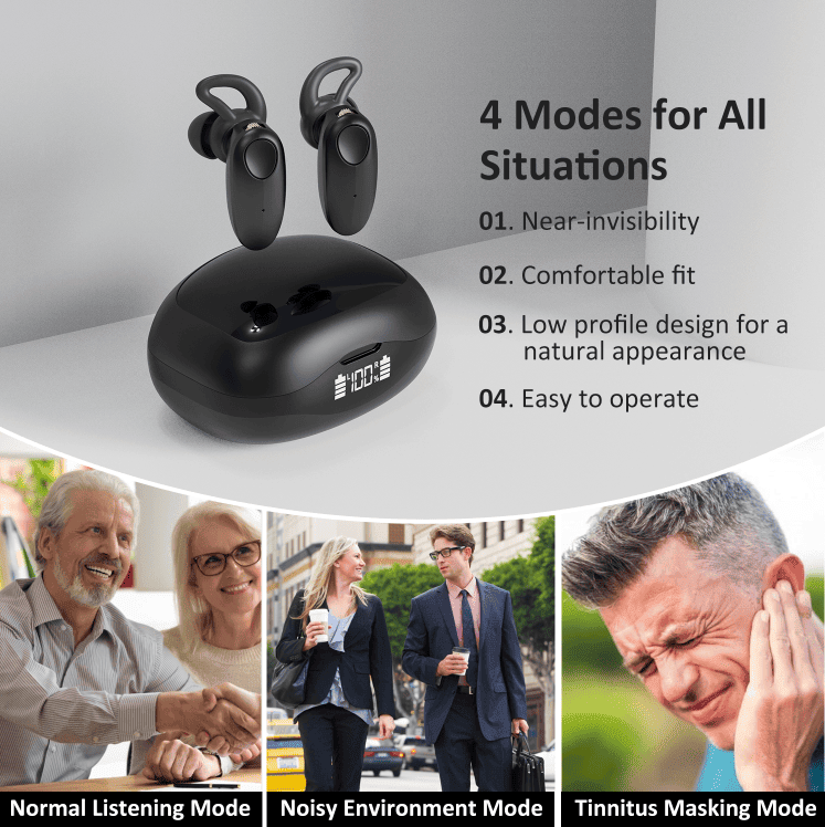 The intelligent microchip can amplify the sound up to 55 decibels, within the safe standard range for human ear health. The device has four levels of volume control and four operating modes.
